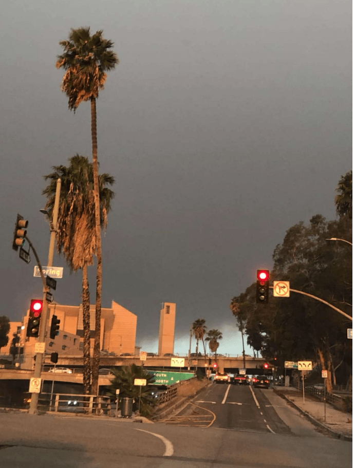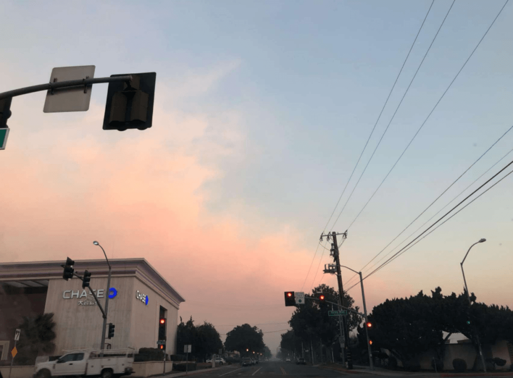 1月7號星期二傍晚,下班回家的路上,已經感覺到聖塔安娜焚風的厲害,路上開始佈滿了樹葉、樹枝和垃圾,車子也感覺有些搖晃,回家不久後就停電了。第二天早上,電力還是沒有恢復,我出門上班看見的天空一片濃煙密佈。就像在電視上看到戰爭地區的天空一樣,我因為害怕交通受到管制,提早許多時間出門。在洛杉磯市中心剛出了高速公路的時候,收到同事的短訊說,中央圖書館沒有電力供應,不久後收到上司的短訊,說洛杉磯市立圖書館全面關閉,在掉頭回家的路上想替父母親買早餐,但是位於Monterey Park 和Alhambra 的台式早餐店,都因為停電的關係而沒有營業,最後找到在離家幾公里的一家麥當勞有營業,但是排隊排到門外!之後收到工作地點傳來的短訊和電郵要我們回應,以確保我們的安全與否,之後的一整天,同事之間的互相傳遞消息、確認大家都平安。因為家中繼續停電,我無法上網和看電視以了解山火蔓延的情況。還好家中有一台二十多年前買的用電池的小收音機,於是全家便靠著它得知山火蔓延和撤退的最新消息。 因為繼續停電,午餐和晚餐都要靠外賣餐點解決,而附近有電力供應,可以營業的餐廳則忙到不可開交,打電話點餐的時候,被告知需要等半個小時以上!因為我一直需要和公司聯絡,手機很快就沒有電了,傍晚時,我想到可以在家裡附近的天仁茗茶cafe充電時,電力終於在我準備出門時恢復了。